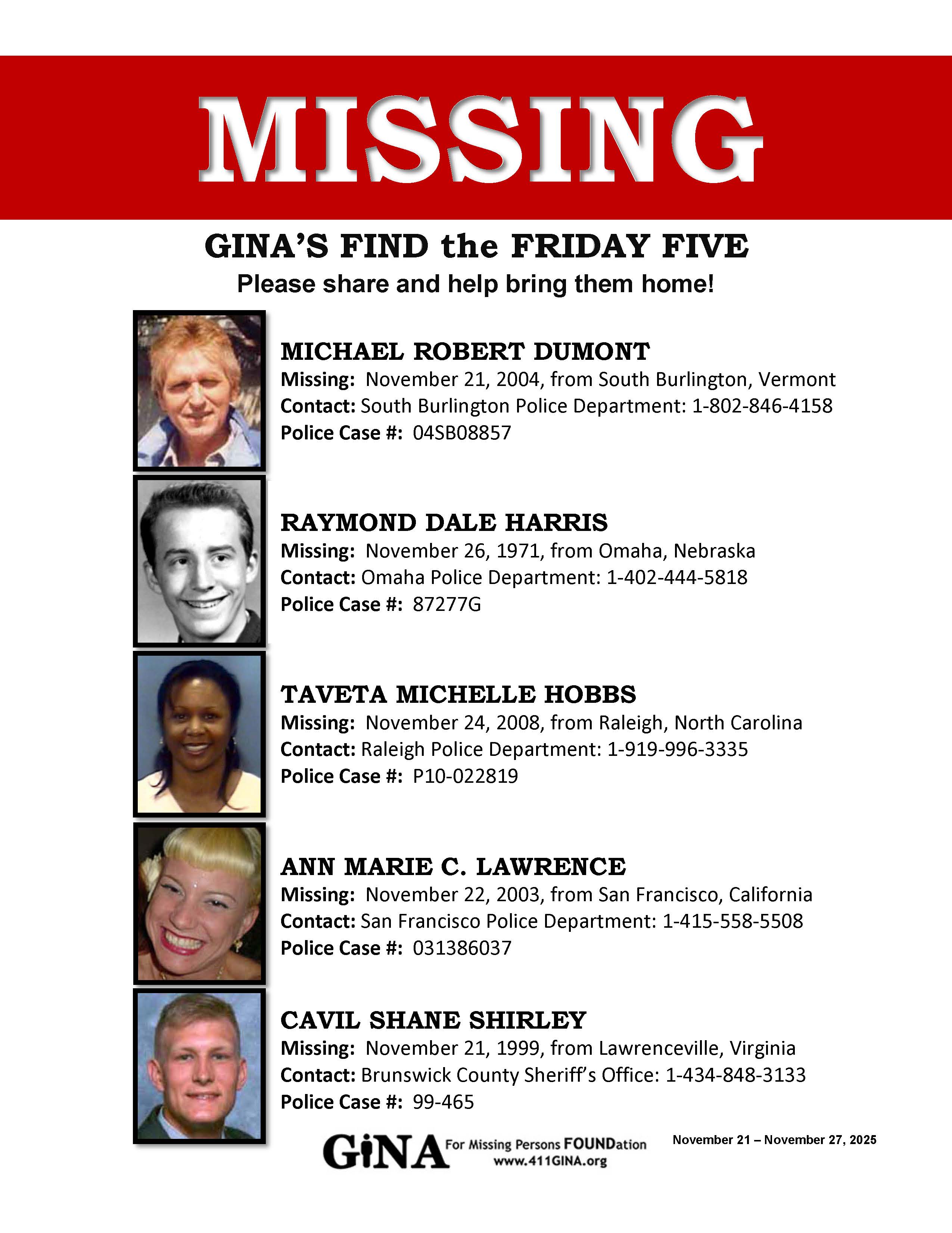 A few Nebraskans with missing loved ones were drawn together through shared grief. We felt a designated day that recognizes our loved ones would give us hope. Nebraska Missing Persons Day LB 1102 was signed into legislation in the spring of 2024. The Second Annual Nebraska Missing Persons Day was held on October 17, 2025 in Lincoln, Nebraska, sponsored by the GINA For Missing Persons FOUNDation.
