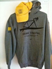 A yellow Cycle Oregon baseball hat, a gray Cycle Oregon hoodie sweatshirt, black athletic pants, a Petzl brand headlamp, a blue Cycle Oregon wristband, and brown bike shoes. He was possibly wearing black Converse prescription glasses and carrying a black over-the-shoulder bag.