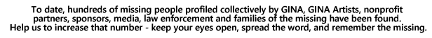 Like so many others who provide you with live concerts, the global pandemic prompted us to rethink ways to present the 2020 Squeaky Wheel® Tour. Due to the worldwide health crisis, we at GINA for Missing Persons FOUNDation opted to keep your safety – and ours – a top priority, and as such, we presented the Tour in a one-day online global event through Social Media held on October 17, 2020. Viewed from anywhere in the world, participants included national and international artists, families of the missing, and more as they voiced a global effort to bring the missing home.